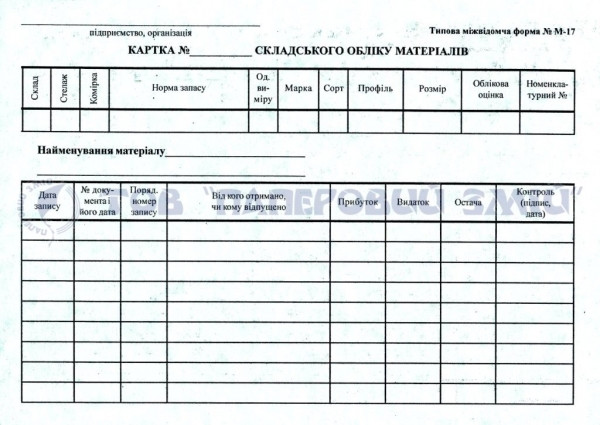 Картка складського обліку (М-17) формату А5 має 100 аркушів і застосовується для відображення місця знаходження і руху матеріалів (прихід, витрата, залишок) на складі. Окрема картка складського обліку матеріалів заповнюється на кожен вид, сорт, розмір, профіль кожного з матеріалів, наявних на складі.